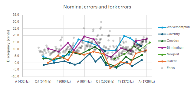 There are discrepancies of up to +20 cents and -5 cents, i.e. a total range of a quarter of a semitone. The range of variation for each peal means that the discrepancies are not due to recording speed or temperature effects. The explanation is errors in the tuning forks, as described here. The following chart shows the discrepancies in nominals and forks plotted against the note: