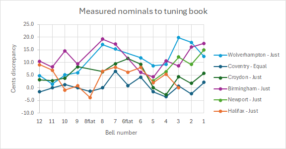 As can be seen from the previous table, the as-shipped nominals are very close to the desired temperament. The nominals actually measured in the bells today give a very different picture as seen in the following chart, which compares the measured nominals against the tuning book figures: